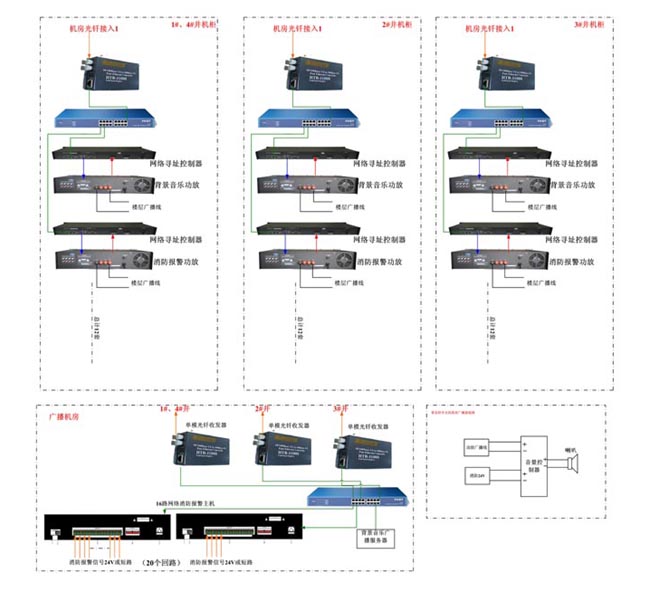 泰州碧桂園五星級(jí)大酒店位于江蘇省泰州市海陵區(qū)泰東河大橋北側(cè),地處生態(tài)旅游區(qū)。本次廣播設(shè)計(jì)安裝全金屬音箱1265只,按照功能分為40個(gè)區(qū)域,每個(gè)區(qū)域同時(shí)播放不同背景音樂(lè);設(shè)置中心主控機(jī)房一個(gè),分中心機(jī)房4個(gè);廣播系統(tǒng)與酒店消防報(bào)警系統(tǒng)聯(lián)動(dòng)實(shí)現(xiàn)N-3、N-2、N-1、N、N+1、N+2、N+3報(bào)警。
