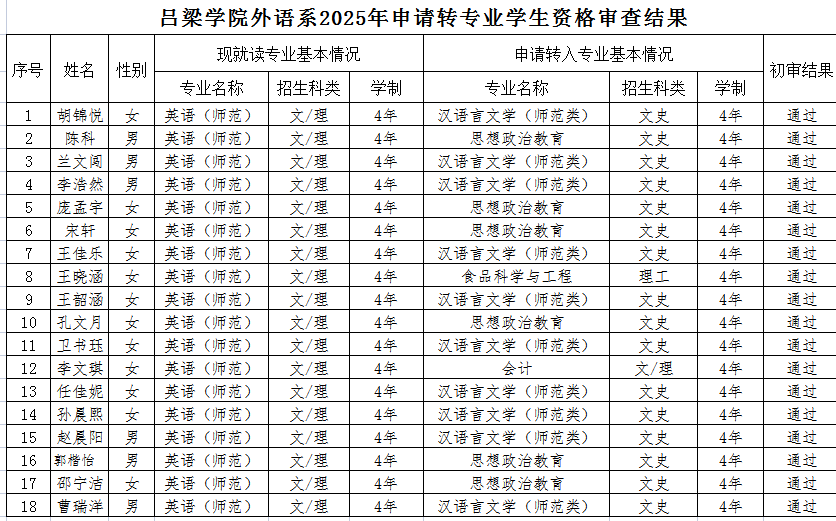 根据《关于做好我校2025年度转专业工作的通知》(院教函[2025]44号)文件要求,我系按照《办法》(院政〔2024〕29号)中相关要求,对TYC234CC太阳2025年度申请转出学生的申请材料进行了初审,经系党政联席会议审核,现将初审结果进行公示。公示期:2025年7月16日-7月18日。如有异议,请反馈给杨贻顺老师。