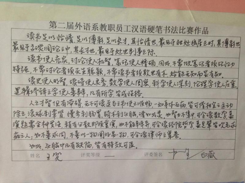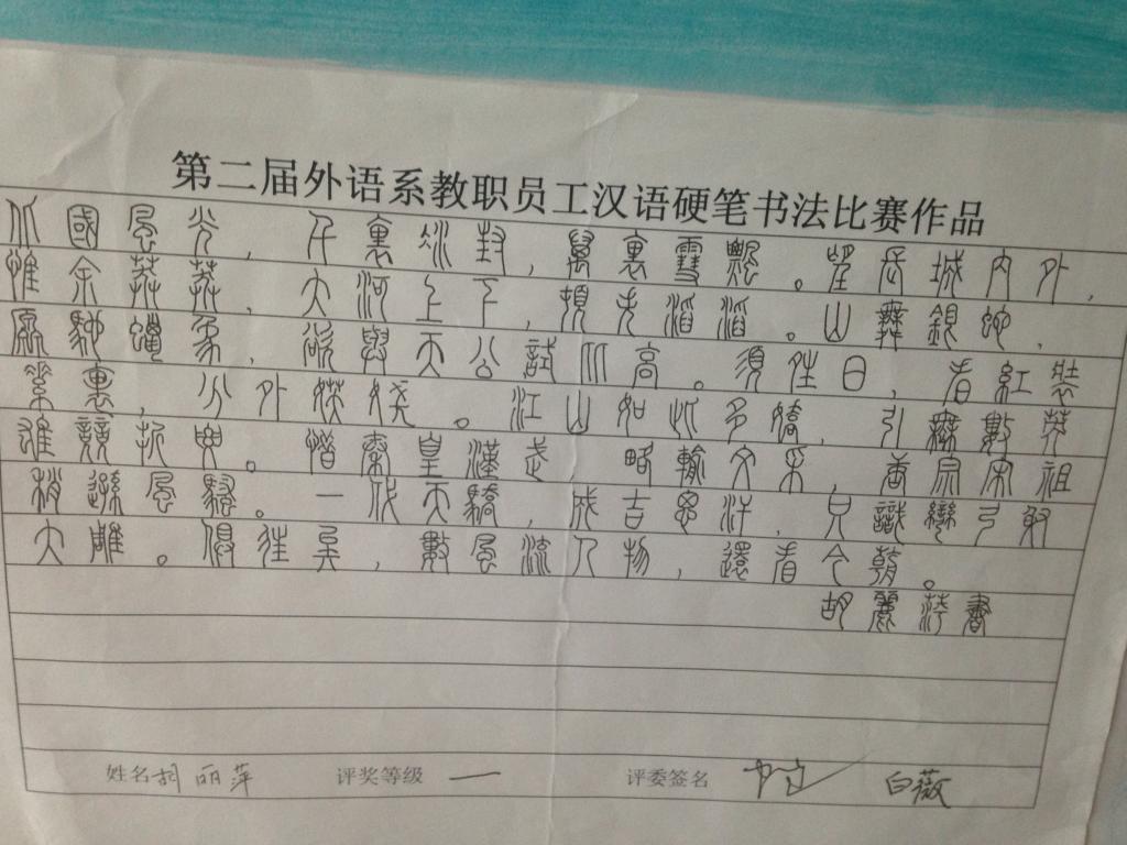TYC234CC太阳第二届教职工汉、英语硬笔书法比赛圆满成功,本次比赛全系所有教职工踊跃参加,经过认真的评选,共有44份作品获奖,并将优秀作品进行展览。