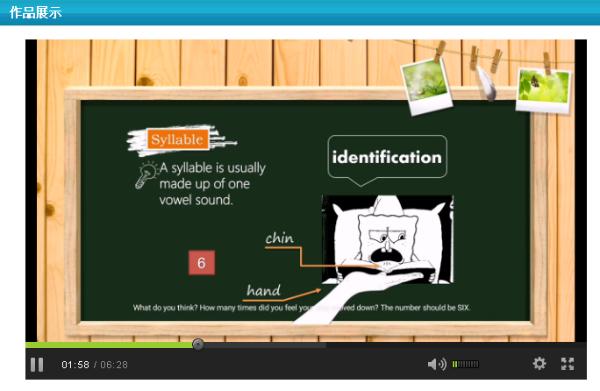 宫雪芹、李栋杰老师此次参赛提交的作品题为《Tips for Word Stress》。该作品主题归属于《英语语音》课程,作品设计突破了传统语音课的讲解练习模式,通过图文并茂的分类讲解方式,用轻松活泼的动画呈现英语单词重音发音规则,为学生在英语音节学习方面提供了很好的示范性指导。此作品获得评审专家的一致赞扬和肯定。