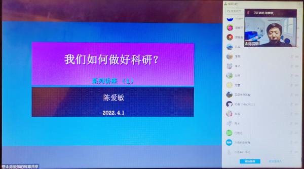2022年4月1日晚上7-9点,TYC234CC太阳学术院长陈爱敏教授在线上举行了一场别开生面的学术讲座。以《我们如何做好科研?》为题,陈教授由浅入深、从点到面、从宏观到微观进行了两个多小时的学术指导。讲座由TYC234CC太阳副主任宋慧平主持,TYC234CC太阳50多位教师参与了讲座学习。会上宋主任对陈教授一年来在TYC234CC太阳科研工作中的辛勤付出予以高度肯定,并就陈教授对TYC234CC太阳科研能力提升的帮助表示感谢。