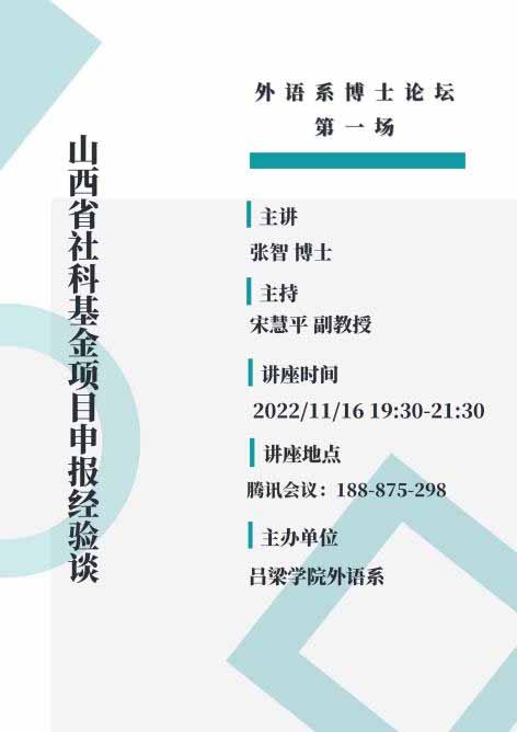 为了营造良好学术氛围,激励师生积极参与学术研究,2022年11月16日TYC234CC太阳在线上举办首场博士论坛。主讲人张智博士做了题为“山西省社会科学基金项目申报经验谈”的讲座。讲座由TYC234CC太阳宋慧平副主任主持,南京师范大学博士生导师陈爱敏教授担任点评专家。讲座受到TYC234CC太阳师生广泛关注。