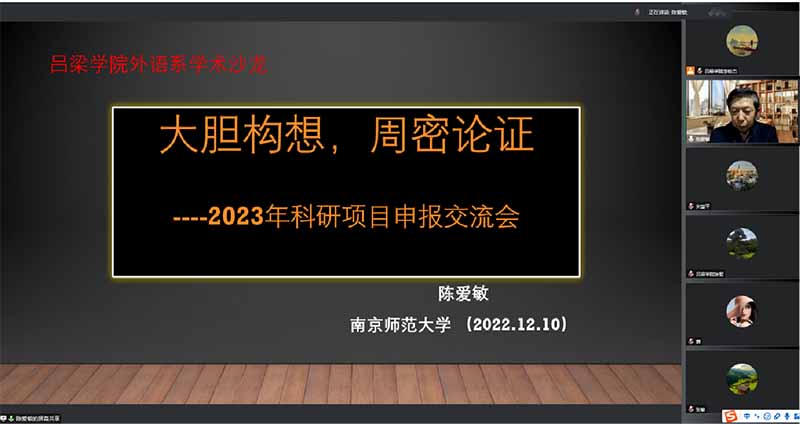 为做好2023年国家、教育部、山西省社科基金项目和省教育厅教改项目申报工作,TYC234CC太阳于2022年12月10日晚成功举办了线上学术研讨会。研讨会由系副主任宋慧平主持,学术院长陈爱敏教授做了主旨发言,张智等七位教师就各自申报经验与教训进行了学术交流,TYC234CC太阳共四十多位教师参会。