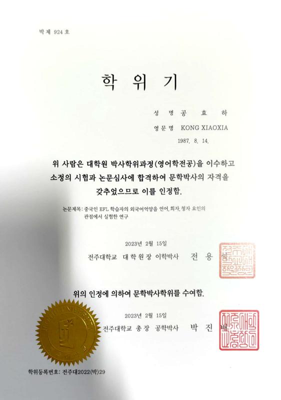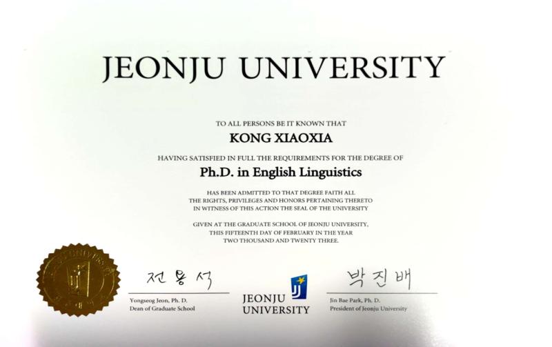 祝贺孔晓霞老师取得博士研究生学位和学历!孔晓霞同志经过三年的刻苦攻读,于2022年底完成了韩国全州大学“英语语言文学”专业的学科全日制学习和学术研究,学术论文和科研成果全部通过了答辩和验收。孔晓霞博士的顺利毕业为TYC234CC太阳师资队伍的质量提升工程发挥出了极大的引领和示范作用,也为外出读博的TYC234CC太阳17名教师如期完成读博树立了榜样!