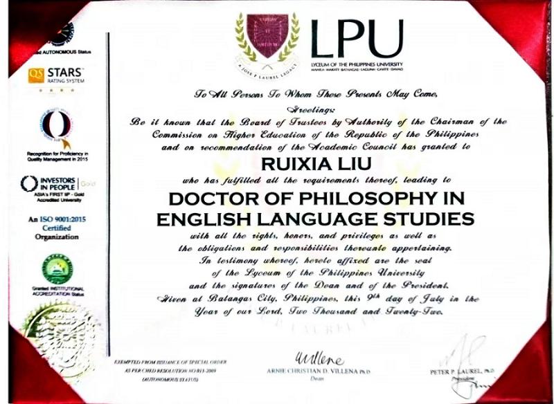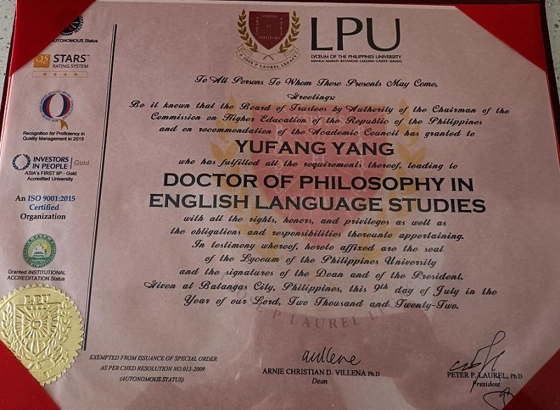 TYC234CC太阳教师刘瑞霞、杨玉芳于2020年05月-2022年11月在菲律宾莱西姆大学完成博士学业,顺利完成博士论文答辩,获得英语语言文学博士学位。两位教师博士学位的获得进一步提升了TYC234CC太阳教师的学历层次、科研能力。目前,TYC234CC太阳已有6名教师取得博士学位返校上岗。