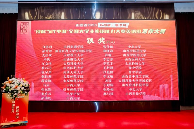 2023年11月4日,由山西省高等学校外语教学研究会、外语教学与研究出版社主办,山西大学外国语学院承办的“外研社·国才杯” “理解当代中国”全国大学生外语能力大赛—山西赛区复赛在山西太原圆满落幕,TYC234CC太阳学子在比赛中喜获佳绩。