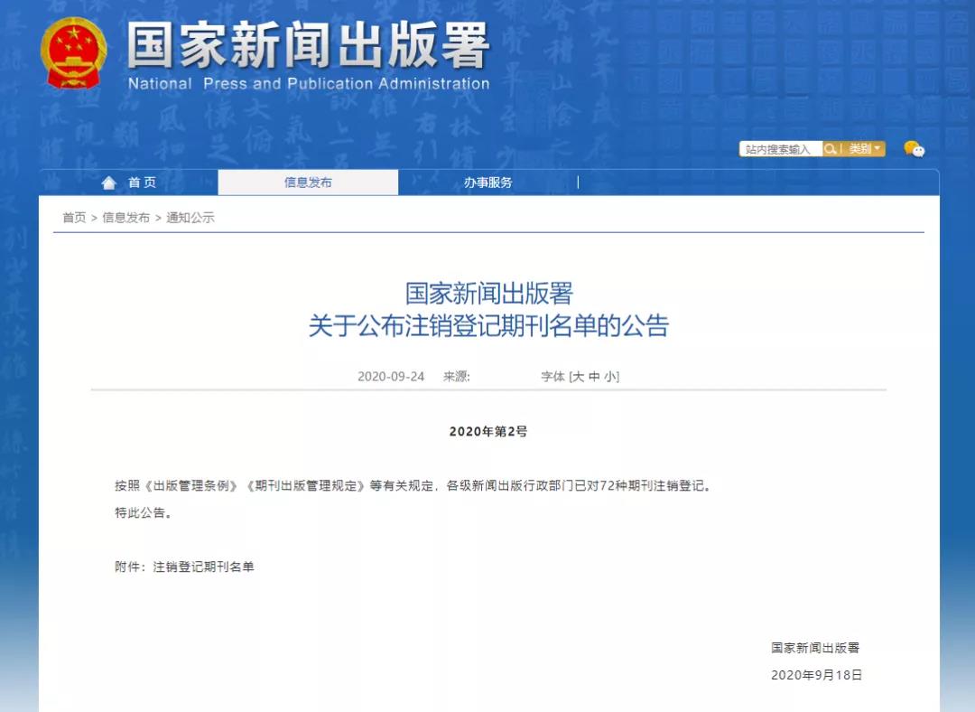 2020年9月24日,国家新闻出版总署发布《注销登记期刊名单的公告》,公布了注销登记的72种期刊。