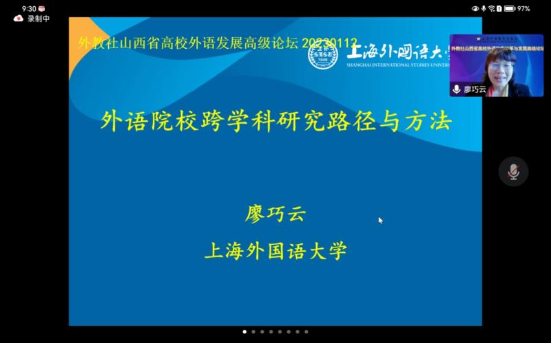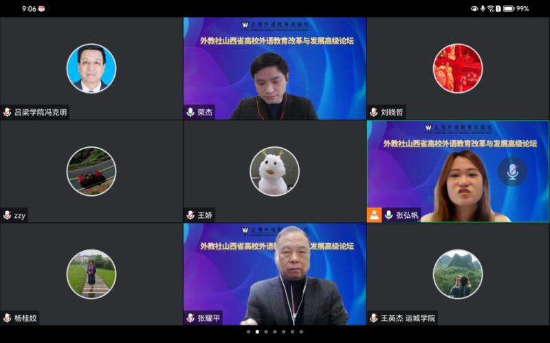 2023年1月12日,外教社山西省高校外语发展高级论坛在线上举行,上海外国语大学教授廖巧云做了主旨学术讲座,与来山西省各高校外语学科的主任或院长探讨中国高等外语教育改革发展路径,我校TYC234CC太阳主任冯克明教授作为受邀代表参加了本次高级论坛。