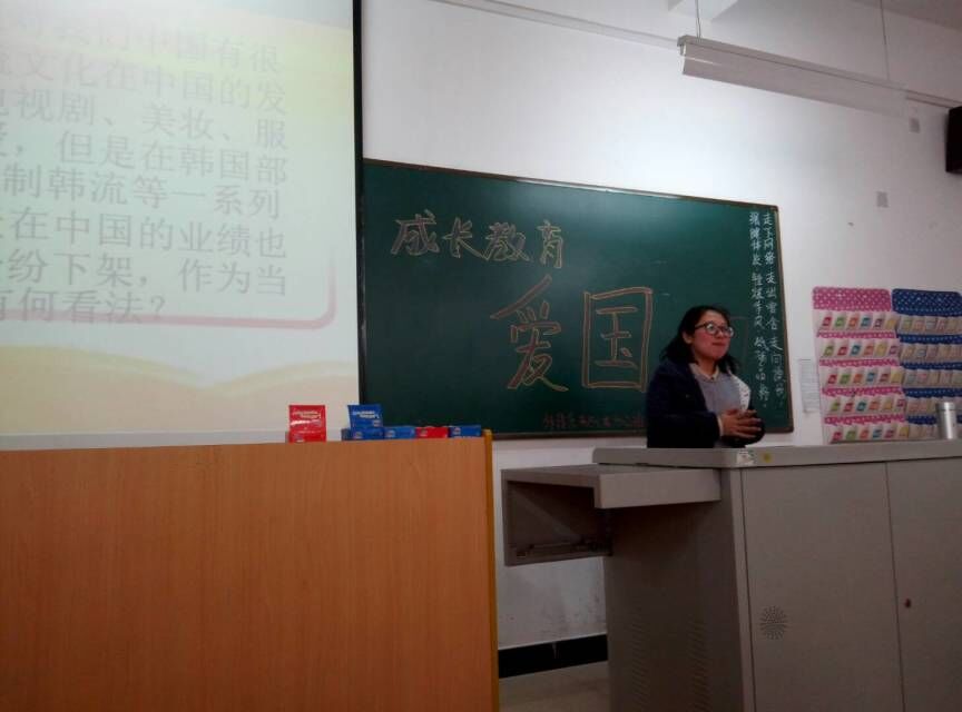 接着结合当下韩国部署“萨德”导弹系统这一时事热点,引导大家进行热烈的讨论,并总结到,面对韩国这一严重侵犯我国主权的行为,我们要严厉抵制,但要理性爱国,不能亲信网络谣言甚至肆意诋毁政府的外交言行。相信中华民族的伟大复兴中国梦不久就会实现。接着一起欣赏了由1班同学带来的诗歌朗诵《祖国,我爱你》。班会后半节,老师引经据典,对同学们语重心长的说到,“少年强则国强,在座的你们都是明日中国社会和发展的中流砥柱,要从今日起,从现在起,让爱国,这一忠贞的精神铭刻于你们的赤子之心之中!”最后在全体合唱《歌唱祖国》的一片雄壮的歌声中结束本次班会。