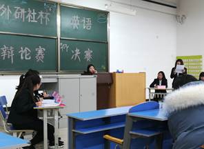 在同学们到齐、各位评委老师入座后,主持人用流利的双语主持拉开了此次辩论赛决赛的序幕。该辩论的辩题为“The house would ban employer accessing propretion employees'criminal record(国家将禁止雇主查阅雇员的犯罪记录)”。首先,由正反方首相陈述了各自观点。再由正方副首相许庆开始发言,在此期间,反方辩手找到了许庆发言的漏洞,双方开始激烈的辩驳,最终正方许庆防守成功;在反方副首相发言期间,正方进行了更加激烈的反驳,双方互不相让;同样在正方成员黄月荣发言时,反方集中火力打算拉下她,但没想象到黄月荣利用一个又一个的例子进行了反击,守住了自家堡垒;在正反方党鞭进行最后的总结时,双方也不甘示弱,全力反击对方。这场拉锯战在裁判的黄牌中宣告结束,双方辩手意犹未尽。最后,评委老师选出了黄月荣、张建婷两名冠军;杨雨婷、张穗穗两名亚军和剩余的四名季军。此次辩论赛圆满落幕。