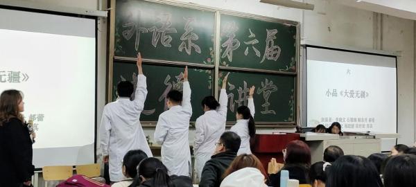 主题活动篇(主要围绕新冠肺炎和绿色中国)。首先是歌曲《起风了》展现了众人赤诚的少年之心。接着是小品《我们在行动》和相声《绿色出行》以诙谐幽默的方式呼吁学生们应增强保护环境的意识。在活动期间,针对道德知识所穿插的精彩互动问答环节既增长了学生道德知识也使得会场氛围更加活跃。然后,《We Are All Fighters》一首中英文朗诵将会场气氛带入高潮,紧接着歌曲《国家》和《平凡天使》深情地赞颂了在疫情面前以“人民生命至上”的伟大祖国和无数逆行英雄们。最后,小品《大爱无疆》和《乌龙快递》展现了疫情之下人情冷暖,党员干部不忘初心,同时也从侧面完美呈现了中国力量和中国速度。
