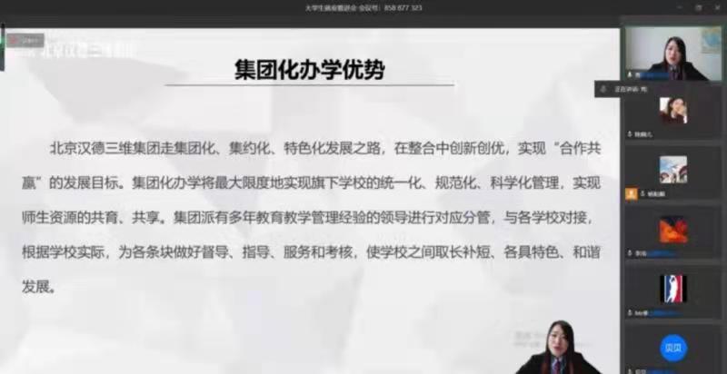 北京汉德三维集团李秀部长对集团旗下的学校及其工作环境进行介绍,指出集团化办学的优势所在,明确表示学校需要中小学各学科教育优秀人才,并就本学校的相关招聘信息做出介绍。李秀部长的悉心指导使得同学们对学校的发展历程、岗位需求、薪资福利等方面有了全面深入的了解,同学们与学校也实现了线上充分交流,最大限度保证了招聘精准度,提高校招效率。